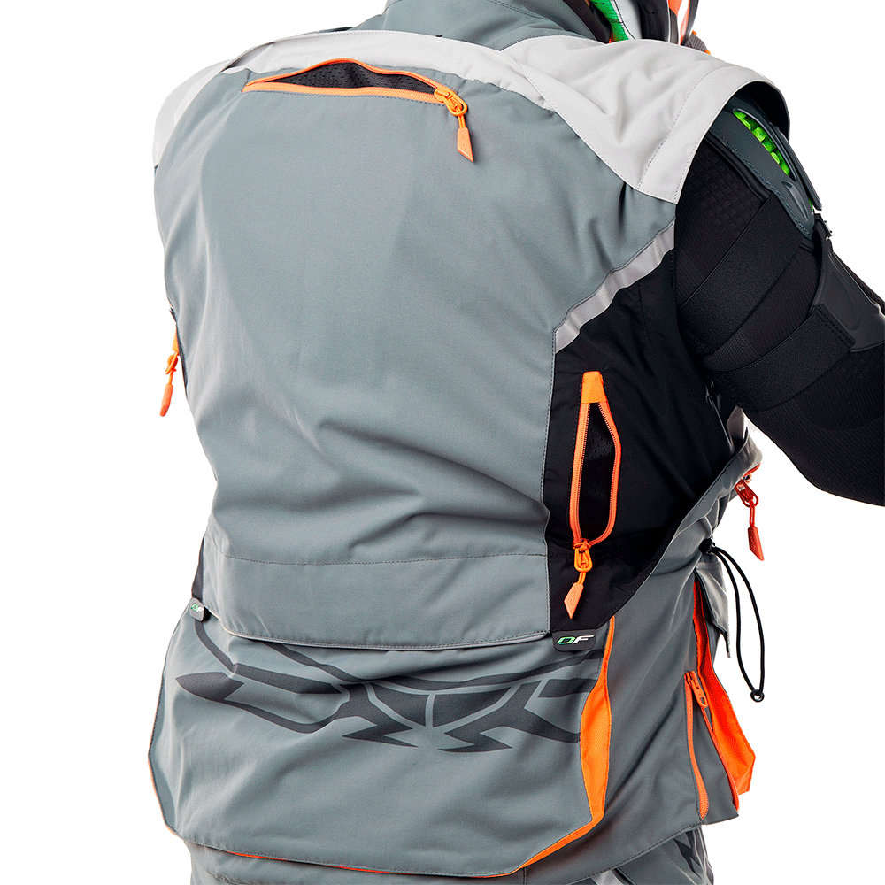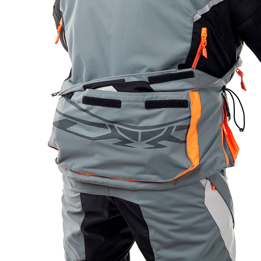 6 наружных карманов, в том числе 2 нагрудных на молнии, 2 накладных на молнии и кнопке с влагозащитным клапаном и люверсом на нижней части, карман на рукаве для транспондера или иных карт. Объемный карман на спине с клапаном на молнии и липах предназначен для снятых рукавов, дорожных карт и прочего, с 2-мя люверсами для отвода излишней влаги. Есть также 2 внутренних кармана. Карман для гидратора с кнопкой для подвесной питьевой системы объёмом 2 литра. Вывод с петлей для питьевой трубки с левой стороны у горловины.