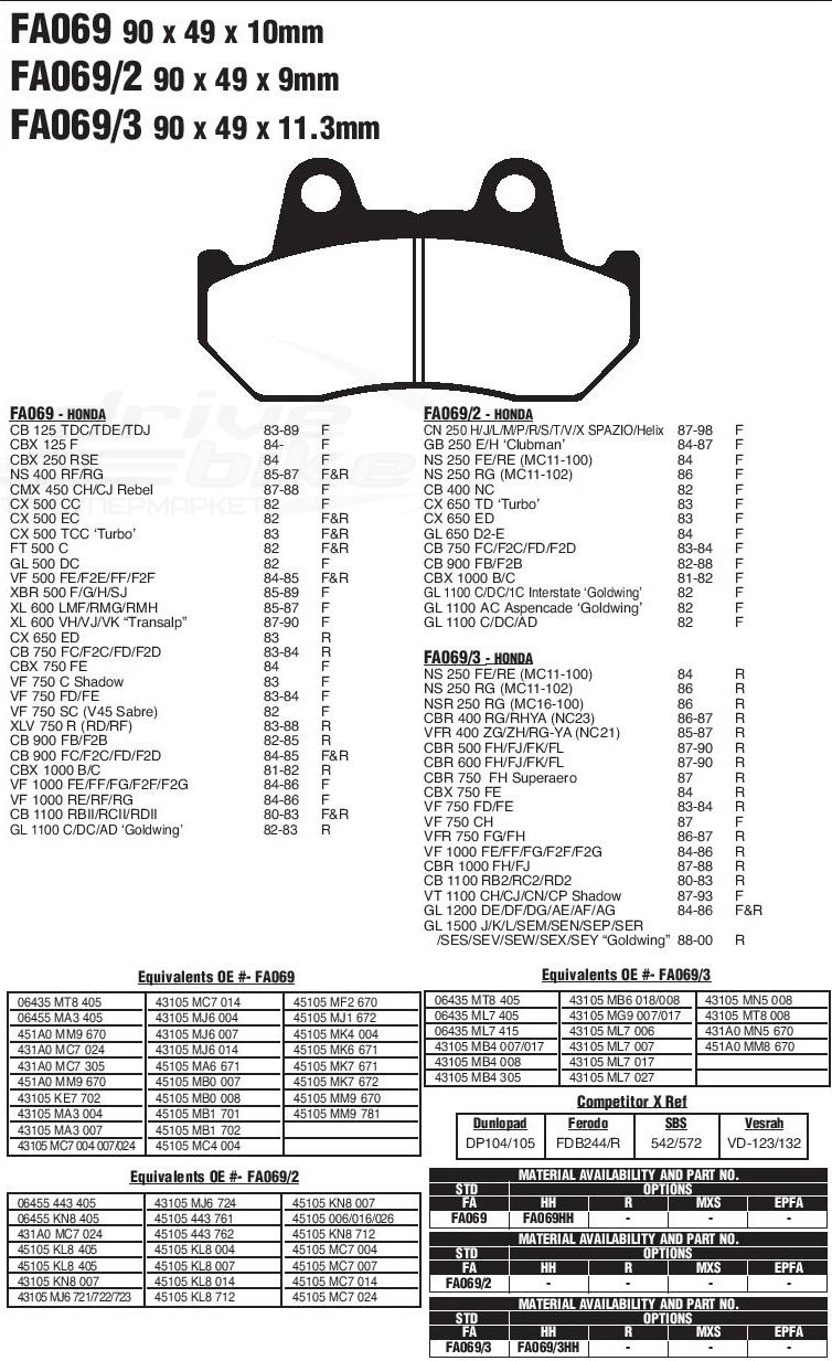 Тормозные колодки EBC FA069 серии Aramid обеспечивают эффективное торможение при любых погодных условиях и стабильные характеристики в независимости . В составе колодок присутсвует материал Aramid, который используется для предотвращения перегрева и преждевременного истирания тормозных колодок, что гарантирует стабильное торможение и длительный срок службы. Имеют хорошую износостойкость и не агрессивны к тормозным дискам. Рекомендованы для использования на классических мотоциклах, чопперах и крузерах.Эта деталь применяется на мотоциклах следующих моделей (полный список см. на картинках-сканах каталога):
