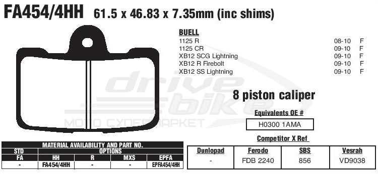 Тормозные колодки EBC FA454/4HH DOUBLE H Sintered (4 шт. в комплекте) с ультра высоким коэффициентом трения созданы на основе медного сплава. Обеспечивают отличную эффективность торможения и длительный срок службы. Рекомендованы для использования на спортбайках, мощных классических мотоциклах и тяжелых крузерах.Эта деталь применяется на мотоциклах следующих моделей (полный список см. на картинках-сканах каталога):