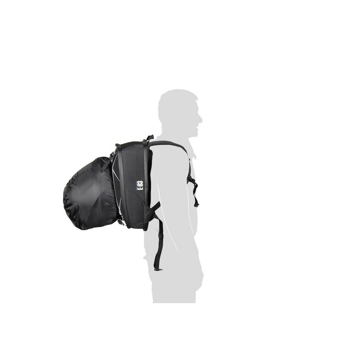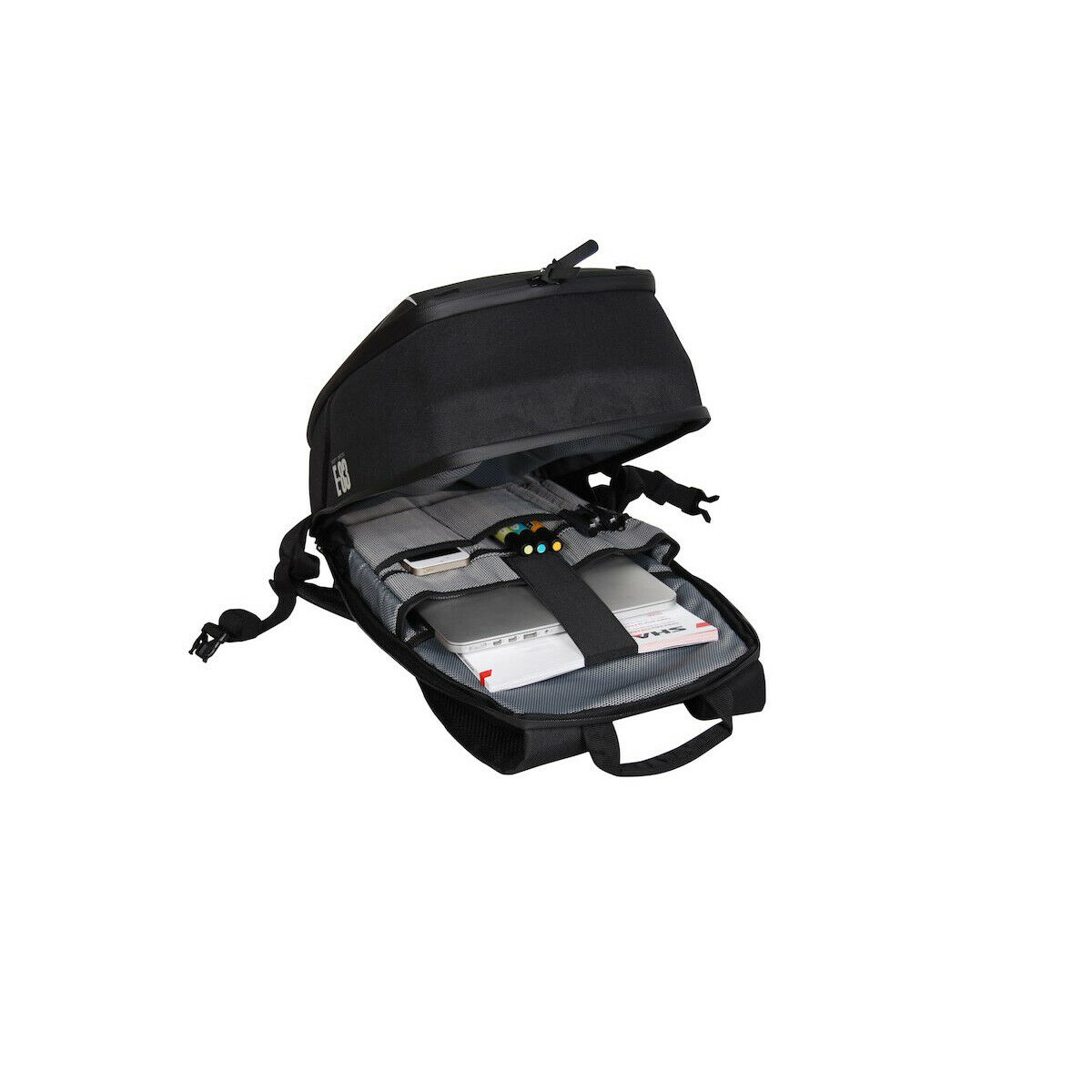 Моторюкзак с отделением для ноутбука, ремнями крепления для шлема и светоотражающими элементами.Полужесткий корпус из термоформованного EVA